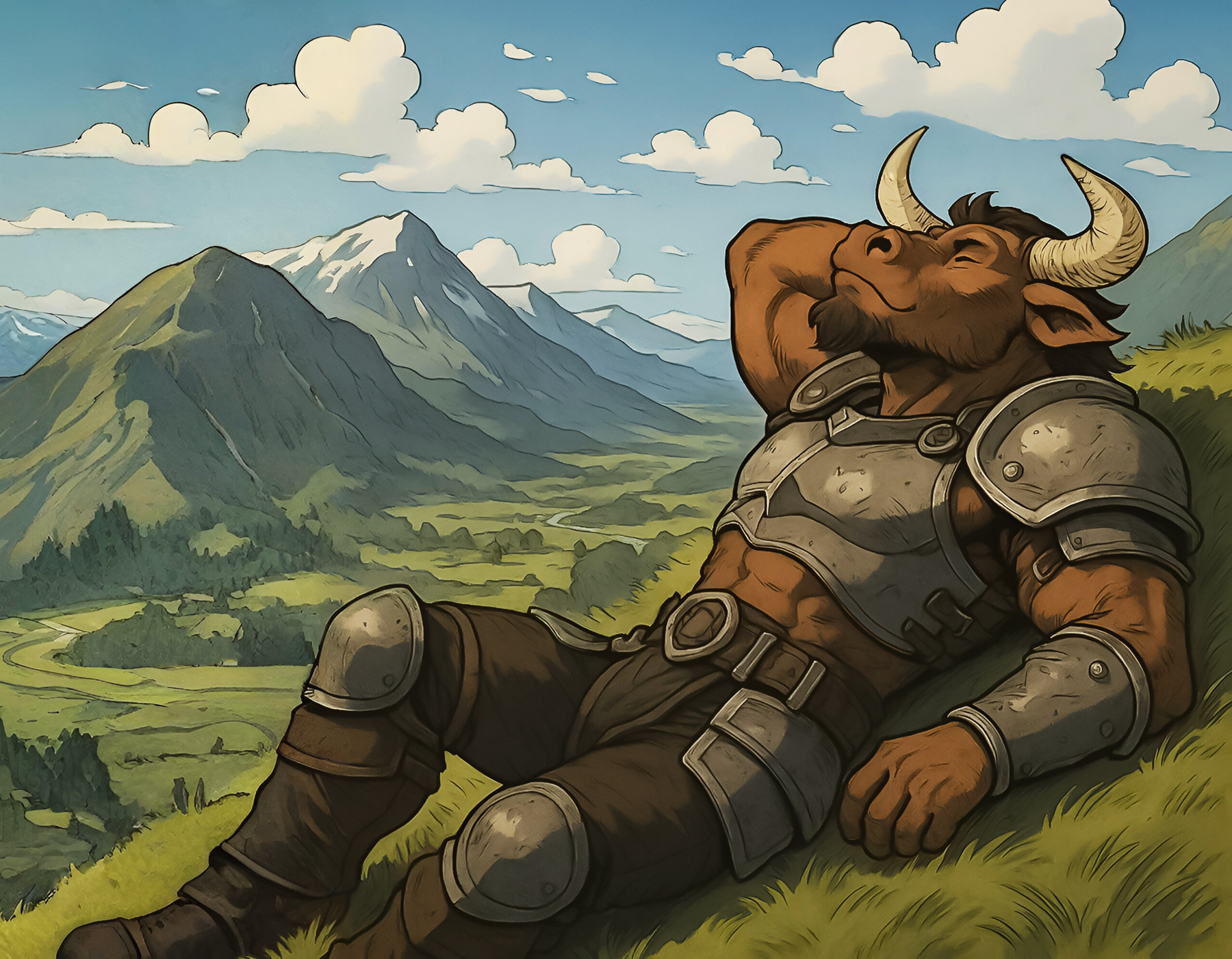To many, he was a beast — a creature born only to fight. Yet in these quiet moments, Agrios knew a deeper truth. The peace he found among the hills was his armor against despair, a reminder of what he protected and why he fought. Ad clouds drifted lazily overhead, the warrior laid peacefully on the lush greenery. Not to forget the battle, but to remember the beauty worth defending.