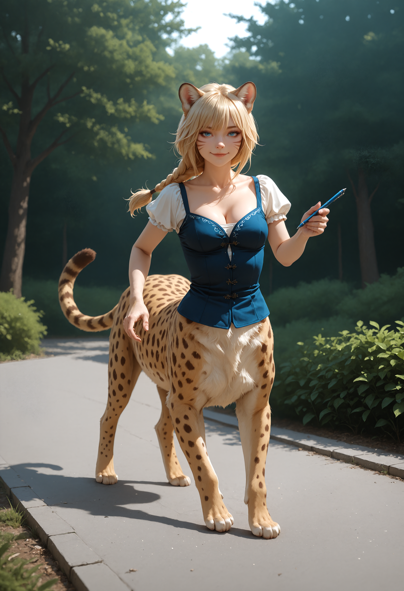,5_fingers, blonde_hair, blue_eyes, braided_hair, breasts, digitigrade, feet, female, fingers, fur, hair, markings, spots, spotted_body, spotted_fur, tail, yellow_body, quadruped, split_form, animal_legs, anatomically_correct_tail, [[[quadruped]]], 4_toes, hindpaw, humanoid_paws, sleek_fur, smooth_fur, detailed_fur