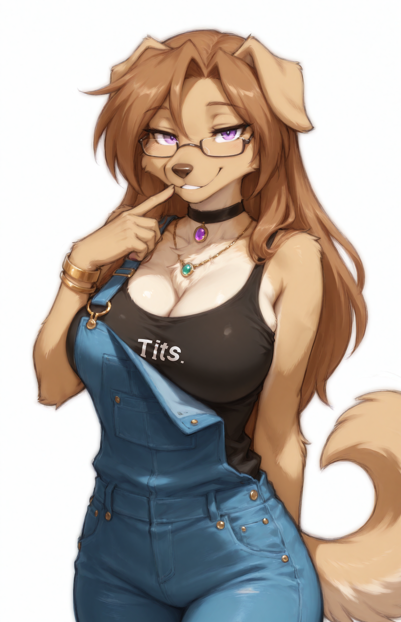 Prompt: score_9, score_8_up, score_7_up, score_6_up, score_5_up, score_4_up, source_furry, BREAK, furry, anthro, detailed face eyes and fur,,solo ,1girl, simple background,, standing,from front , solo focus, choker, necklace, white background, bracelet, lips, black shirt, , wide smile, , half-closed eyes, finger at mouth,, tank top, denim, strap slip,large breasts ,1girl, overalls,looking at viewer, solo,