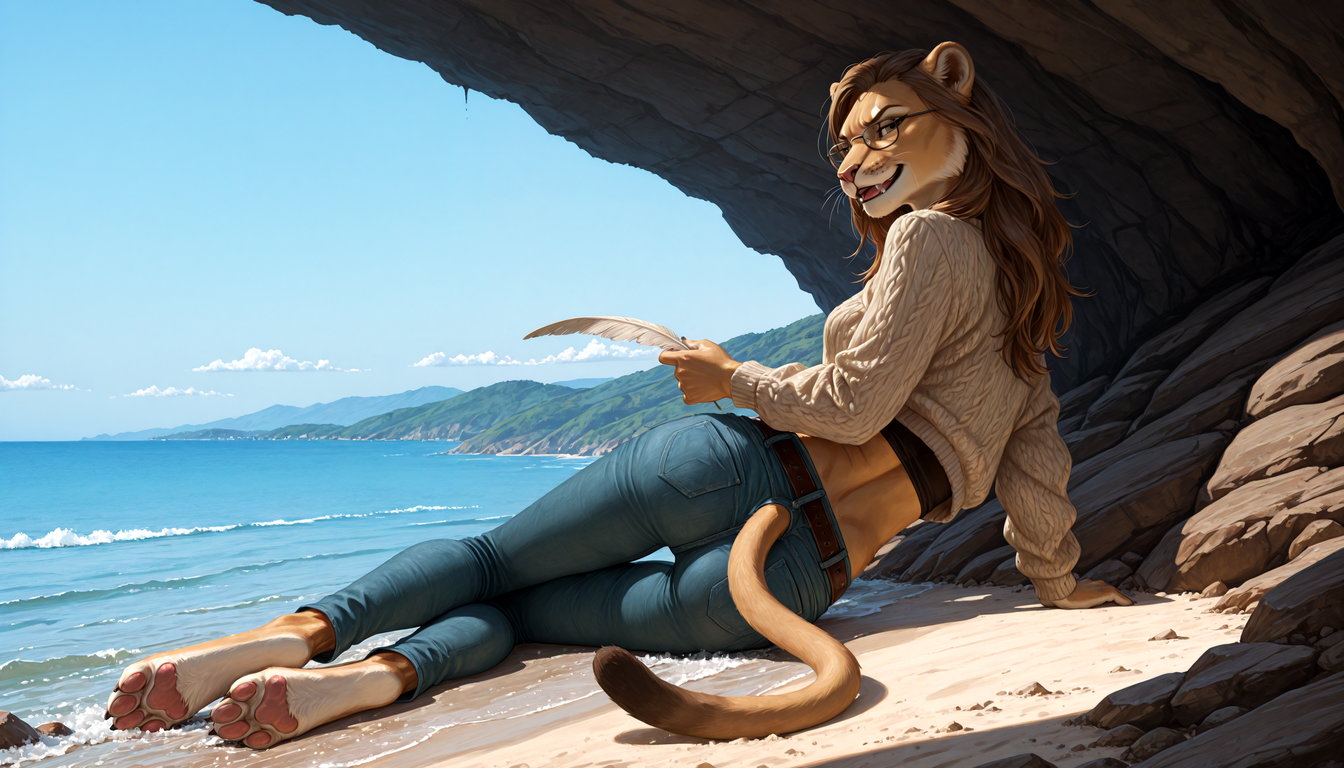 anatomically correct, american_lion, anthro, cougar, domestic_cat, felid, feline, felis, lion, mammal, pantherine, 4_toes, 5_fingers, biped, breasts, brown_hair, claws, feet, female, fur, hair, hindpaw, pawpads, paws, soles, teeth, toe_claws, toes, tongue, looking_at_viewer, looking_back, lying, sitting, angry, sad, smile, belt, bottomwear, brown_topwear, clothed, clothing, crop_top, eyewear, glasses, jacket, midriff, pants, shirt, solo, suit, sweater, thigh_gap, topwear, holding_object, holding_sign, quill, scroll, countershade_face, countershade_fur, countershade_tail, countershade_torso, countershading, digital_media_(artwork), shaded, full-length_portrait, half-length_portrait, portrait, three-quarter_portrait
