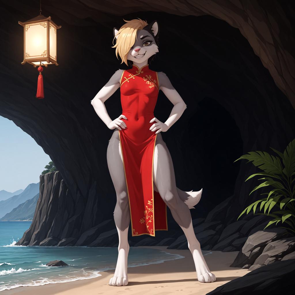 anatomically correct, anthro, canid, canine, canis, domestic_dog, mammal, rodent, sciurid, spitz, 5_fingers, black_body, black_fur, black_hair, blonde_hair, braided_hair, breasts, eyebrows, eyelashes, fangs, female, fingers, fur, grey_body, grey_fur, hair, long_hair, multicolored_body, multicolored_fur, navel, pink_nose, short_hair, small_breasts, tail, teeth, tongue, tuft, white_body, white_fur, hair_over_eye, , hands_on_hips, kneeling, looking_at_viewer, pose, standing, blep, , grin, romantic, seductive, smile, asian_clothing, barefoot, chinese_clothing, chinese_dress, clothed, clothing, dress, east_asian_clothing, lamp, lantern, outside, plant, solo, tree, water, leaning, species_transformation, transformation, , brush, hairbrush, humor, scissors, sheared, unimpressed, countershade_torso, digital_media_(artwork), pinup, headshot_portrait, portrait, three-quarter_portrait