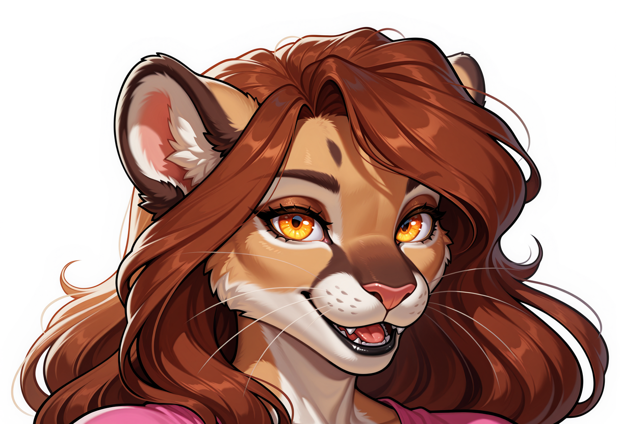 anthro, cougar, felid, feline, mammal, amber_eyes, black_lips, brown_fur, brown_hair, female, fur, hair, inner_ear_fluff, lips, long_hair, orange_eyes, pink_nose, teeth, tuft, whiskers, white_body, white_fur, yellow_eyes, looking_at_viewer, smile, clothed, clothing, open_mouth, transparent_background, fangs, icon, solo, tongue, detailed, digital_media_(artwork), bust_portrait, portrait