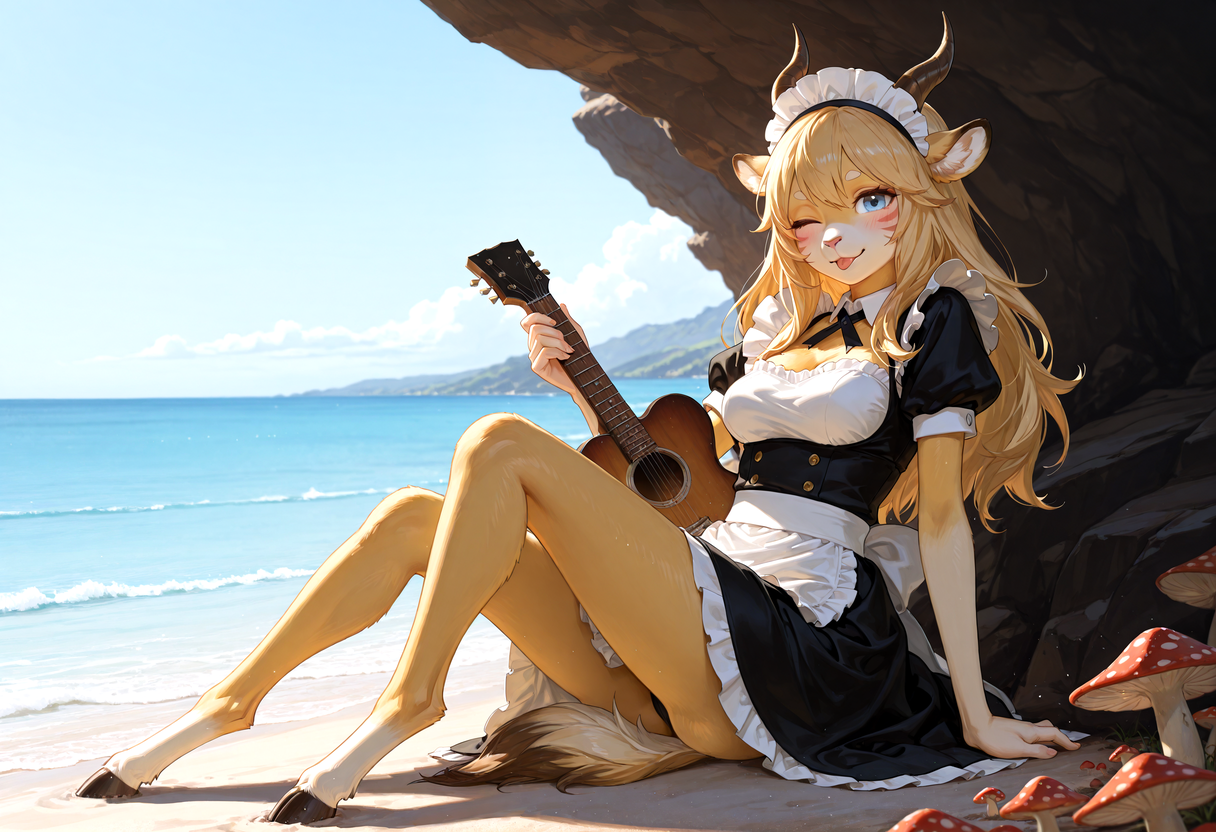 anatomically correct, animal_humanoid, anthro, equid, equine, humanoid, hybrid, mammal, satyr, big_breasts, biped, blonde_hair, blue_eyes, breasts, brown_body, brown_fur, brown_stripes, cheek_tuft, dipstick_tail, eyebrows, facial_markings, facial_tuft, female, fur, hair, head_markings, long_hair, markings, multicolored_body, multicolored_ears, multicolored_fur, multicolored_tail, spiky_hair, striped_body, striped_fur, striped_markings, striped_tail, stripes, tail, tail_markings, tuft, white_body, white_fur, yellow_body, yellow_fur, yellow_tail, ear_over_eye, pose, sitting, blush, seductive, barefoot, clothed, clothing, dress, fully_clothed, inner_ear_fluff, maid_uniform, one_eye_closed, solo, tongue_out, uniform, winking_at_viewer, gender_transformation, transformation, , fungus, guitar, mushroom, countershade_face, countershade_feet, countershade_fur, countershade_hands, countershade_legs, countershade_neck, countershade_torso, countershading, digital_media_(artwork), kemono, shaded, headshot_portrait, portrait