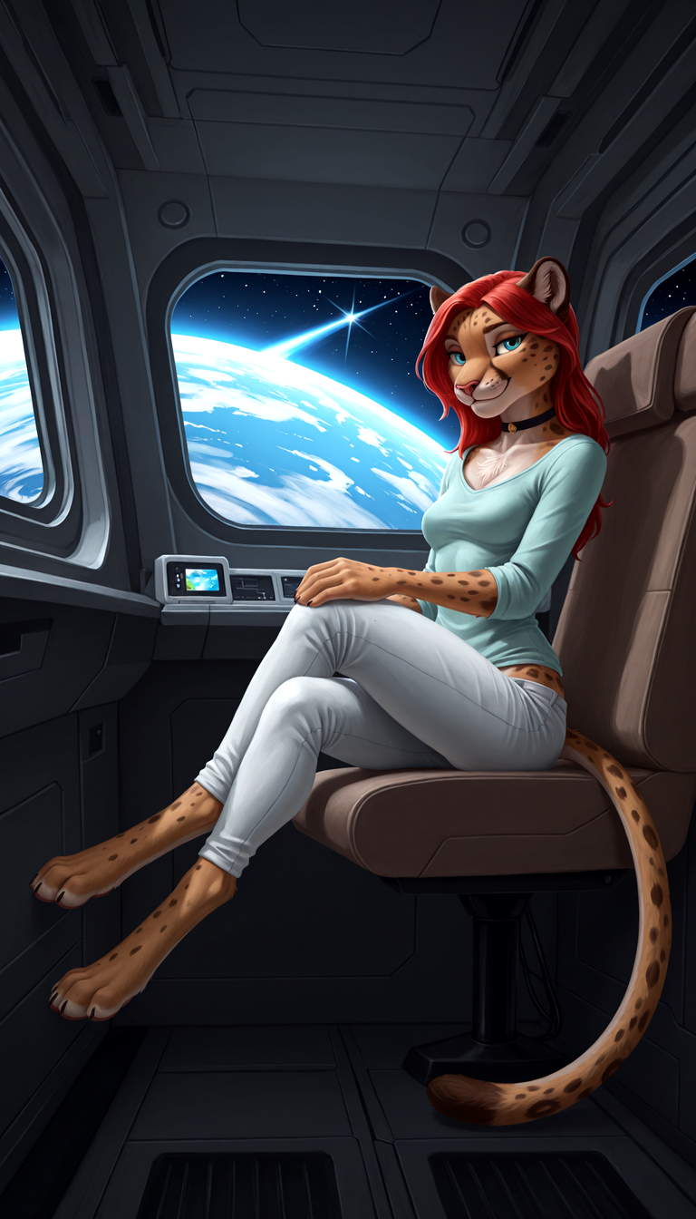 anatomically correct, anthro, cougar, felid, feline, mammal, 4_toes, 5_fingers, biped, breasts, digitigrade, feet, female, fingers, fur, hair, red_hair, tail, toes, looking_at_viewer, sitting, smile, barefoot, bottomwear, choker, clothed, clothing, collar, furniture, inside, jewelry, pants, solo, star, topwear, vehicle, window, planet, spacecraft, digital_media_(artwork)