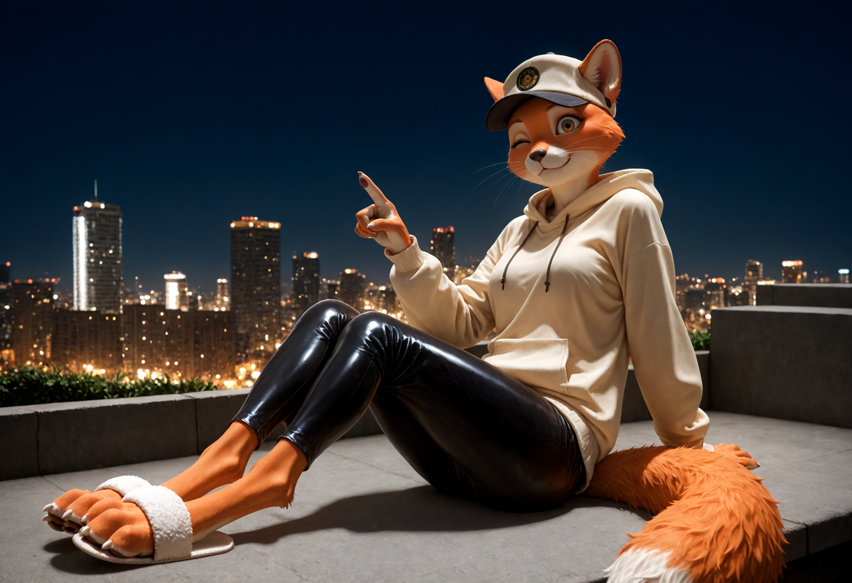 anatomically correct, big_breasts, black_nose, breasts, claws, crossgender, curvy_figure, female, fingers, fur, orange_body, orange_fur, pawpads, tan_body, tan_fur, tuft, whiskers, feet_together_knees_apart, hand_on_own_shin, looking_at_viewer, pose, reclining, sitting, surprise, black_pants, bottomwear, building, city, city_background, clothed, clothing, fully_clothed, hat, headgear, headwear, hoodie, latex_pants, leather, leather_bottomwear, leather_pants, night, outside, pants, solo, sweater, topwear, pointing, wink, , slippers, wreath, countershade_face, countershading, digital_media_(artwork), portrait