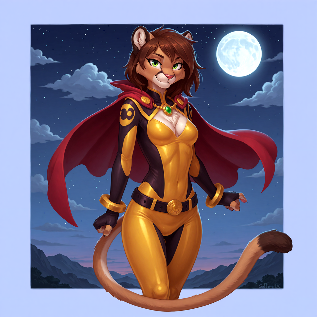 anatomically correct, anthro, cougar, felid, feline, mammal, 5_fingers, biped, breasts, brown_body, brown_fur, brown_hair, claws, dipstick_tail, eyebrows, eyelashes, female, fingers, fur, green_eyes, hair, markings, medium_breasts, multicolored_tail, pink_nose, tail, tail_markings, tan_body, tan_fur, tuft, white_body, white_fur, 4_toes, 5_fingers, digitigrade, animal_legs, fluffy_fur, sleek_fur, smooth_fur, looking_at_viewer, standing, smile, belt, bodysuit, cape, cleavage, clothed, clothing, cloud, cosplay, costume, full_moon, gem, glistening, gloves, handwear, inner_ear_fluff, jewelry, moon, necklace, night, outside, red_cape, red_clothing, skinsuit, sky, solo, star, starry_sky, tight_clothing, white_tail_tip, , superhero, digital_media_(artwork), three-quarter_portrait