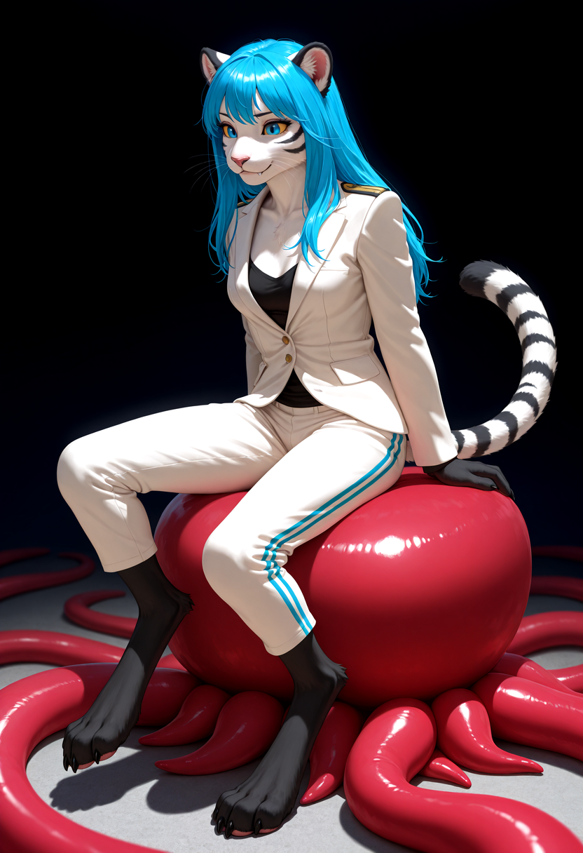 anatomically correct, anthro, extinct, felid, feline, machairodontine, mammal, prehistoric_species, saber-toothed_tiger, 4_toes, 5_fingers, ambiguous_gender, bent_legs, biped, black_body, black_claws, black_fur, black_lips, black_nose, black_pawpads, black_stripes, , blue_eyes, , blue_hair, blue_stripes, breasts, claws, detailed_fur, digitigrade, dipstick_tail, eyelashes, facial_markings, featureless_breasts, feet, female, fingers, fur, hair, handpaw, head_markings, hindpaw, humanoid_hands, lips, long_hair, markings, multicolored_tail, no_sclera, pawpads, paws, pink_nose, pink_pawpads, pivoted_ears, raised_leg, snout, striped_body, striped_fur, striped_markings, striped_tail, stripes, tail, tail_markings, toes, tuft, whiskers, white_body, white_fur, sitting, straddling, , embarrassed, happy, , smile, bottomwear, , clothed, clothing, fully_clothed, jacket, pants, solo, topwear, white_clothing, white_jacket, white_topwear, ear_transformation, foot_transformation, mid_transformation, species_transformation, transformation, multifur, tentacles,  pixel_\(artwork\)  countershading kemono monochrome shaded, portrait