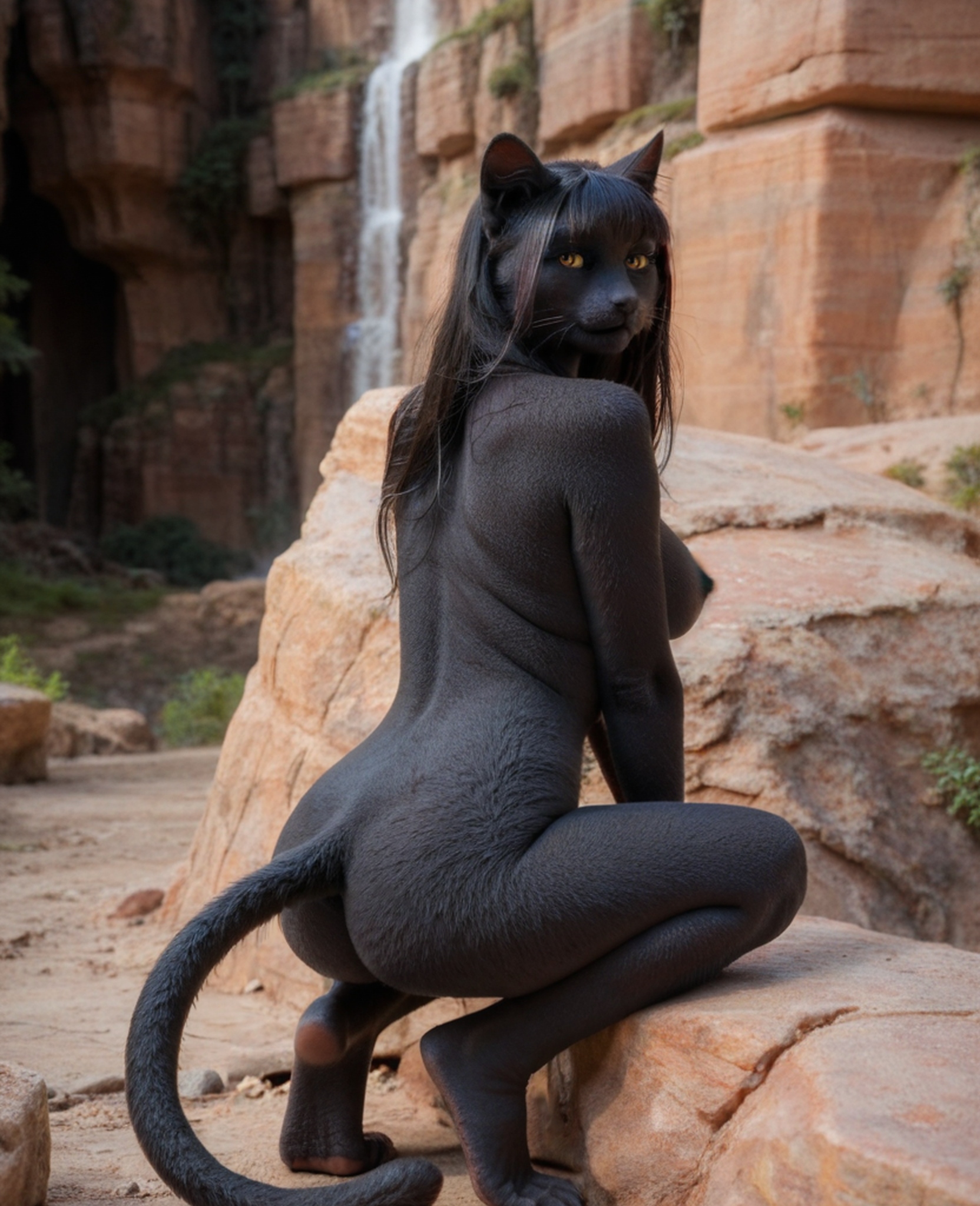 Resized for better resolution, eye touch-ups. My prompts are worded to try to get the real life look of a cat's irises, in the shape of a human's. Here's a REAL cat's eye for reference: