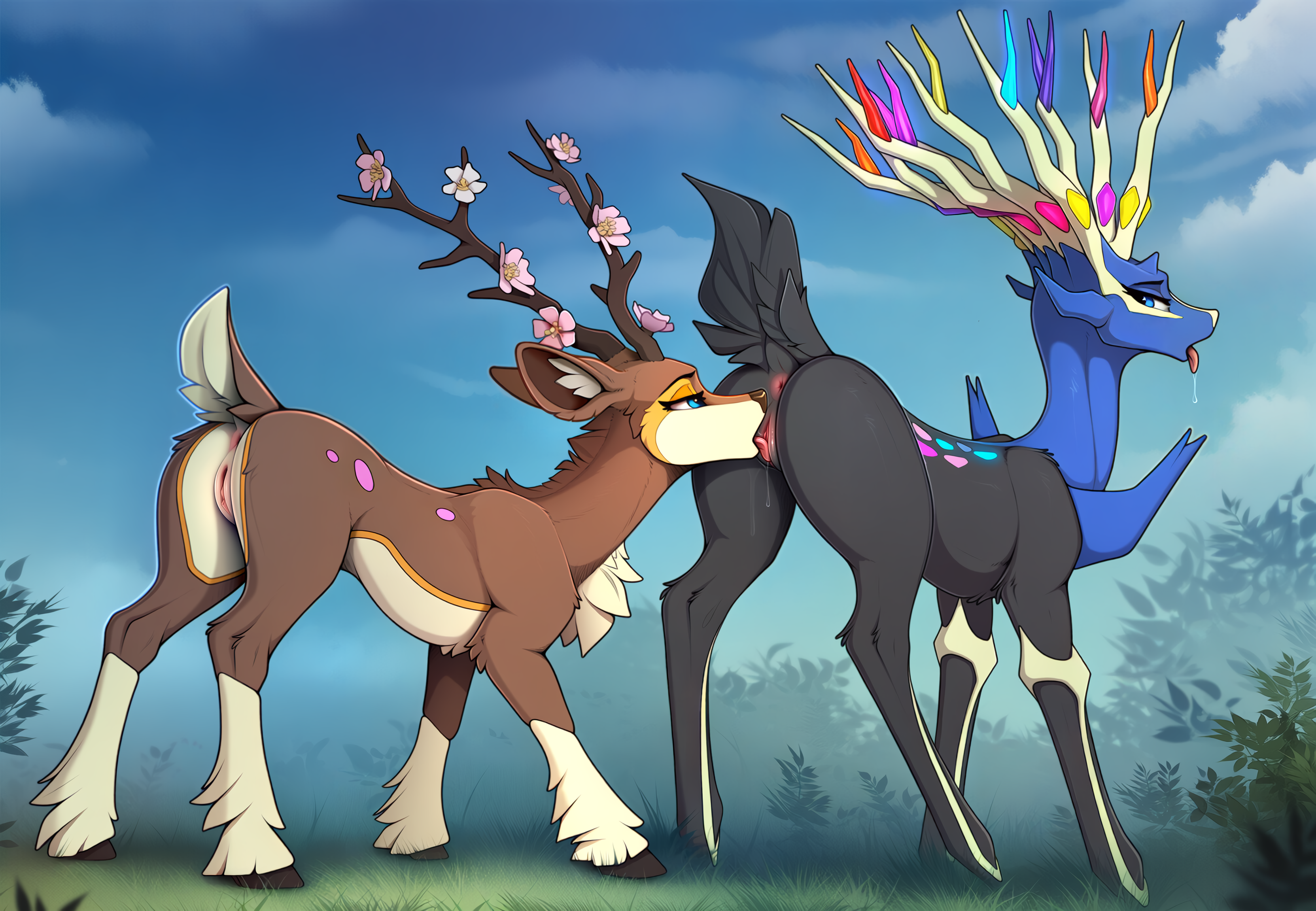 Sawsbuck happily obliged, burrowing her face back into her lover’s rear and continuing to drag her tongue over and through her girlfriend’s sensitive privates. Her own pussy ached with the need for gratification from how turned on she was getting by just eating out her girlfriend’s pussy. Perhaps after she brought Xerneas to her orgasm, she could receive the same pleasure back…