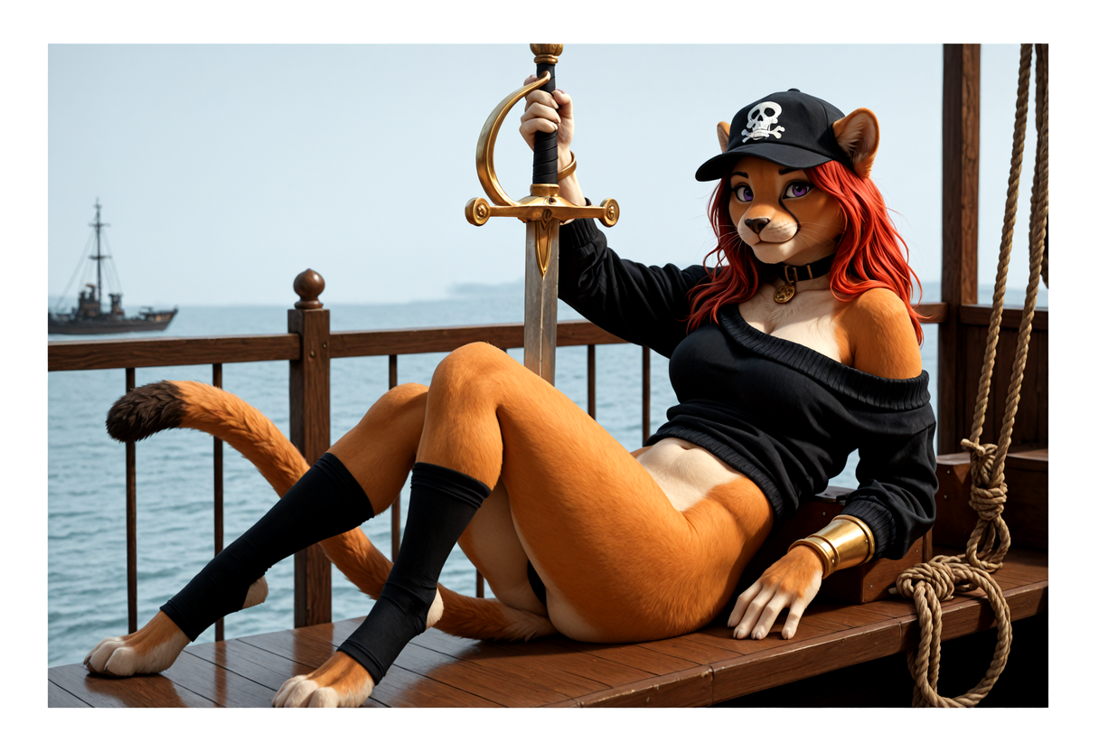 anatomically correct, mammal_taur, taur, felid, felid_taur, humanoid_taur, pantherine, bottomless, biped, black_nose, blue_eyes, breasts, dipstick_tail, feet, female, fur, hair, markings, navel, on_back, orange_body, orange_fur, purple_eyes, red_hair, submissive_female, tail, tail_markings, , arms_above_head, sad, smile, surprise, absurd_res, barefoot, baseball_cap, black_clothing, black_collar, black_hat, black_headwear, black_legwear, black_panties, black_shirt, black_stockings, black_thigh_highs, black_topwear, black_underwear, border, choker, cleavage, clothed, clothing, clothing_bow, collar, curvy_anthro, footwear, furgonomics, grey_background, hand_behind_head, hat, headgear, headwear, hourglass_figured_anthro, hourglass_figured_female, inner_ear_fluff, , legwear, necklace, off_shoulder, outside_border, panties, shirt, shoulderless_sweater, smiling_at_viewer, socks, solo, stirrup_stockings, stockings, sweater, thick_thighs, thigh_highs, thigh_squish, toeless_footwear, toeless_legwear, toeless_socks, toeless_thigh_highs, topwear, underwear, white_border, wide_hipped_anthro, wide_hipped_female, wide_hips, holding_object, holding_sword, railing, , bracers, cannon, cover, pirate, rope, ship, shivah, spats, digital_media_(artwork), photography_(artwork), bust_portrait, half-length_portrait, headshot_portrait, portrait