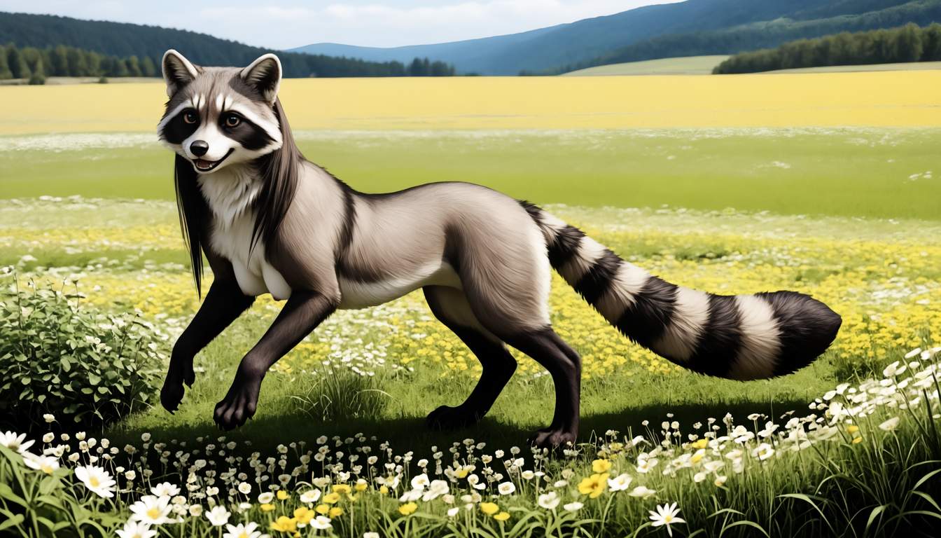 solo, anatomically correct, [[[1species:felid]]],  {1semi-anthro},   {1kemono}, (smooth square butt), woman, medium breasts, long hair with parted bangs, {{{4 toes}}}, {{{{{{digitgrade}}}}},  {{{smile}}}, {{long fur}}, hips, {detailed fur}, {realistic fur}, {{{real}}} , {{{{{{realistic}}}}}} , whole body, tail, (tail hip bone), fur, {{biped}}, hands, {{5 fingers}}, {{{detailed background, outside}}}, adventure, silly, flowers, field, hills, spring, 1raccoon,