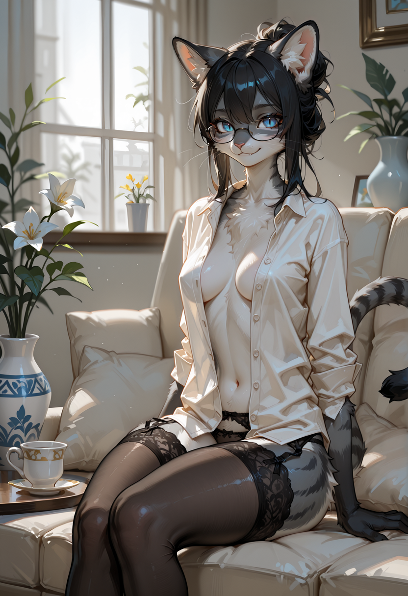 anatomically correct, anthro, domestic_cat, felid, feline, felis, mammal, biped, black_hair, blue_eyes, breasts, female, fur, grey_body, grey_fur, hair, inner_ear_fluff, medium_breasts, navel, pupils, slit_pupils, tail, thigh_highs, tuft, whiskers, white_body, white_fur, looking_at_viewer, sitting, smile, clothed, clothing, container, cup, eyewear, flower, furniture, garter_belt, garter_straps, glasses, inside, legwear, on_sofa, open_clothing, open_shirt, open_topwear, panties, plant, potted_plant, shirt, sofa, solo, stockings, topwear, underwear, white_clothing, white_shirt, white_topwear, lingerie, vase, window, detailed_background, hi_res, digital_media_(artwork)