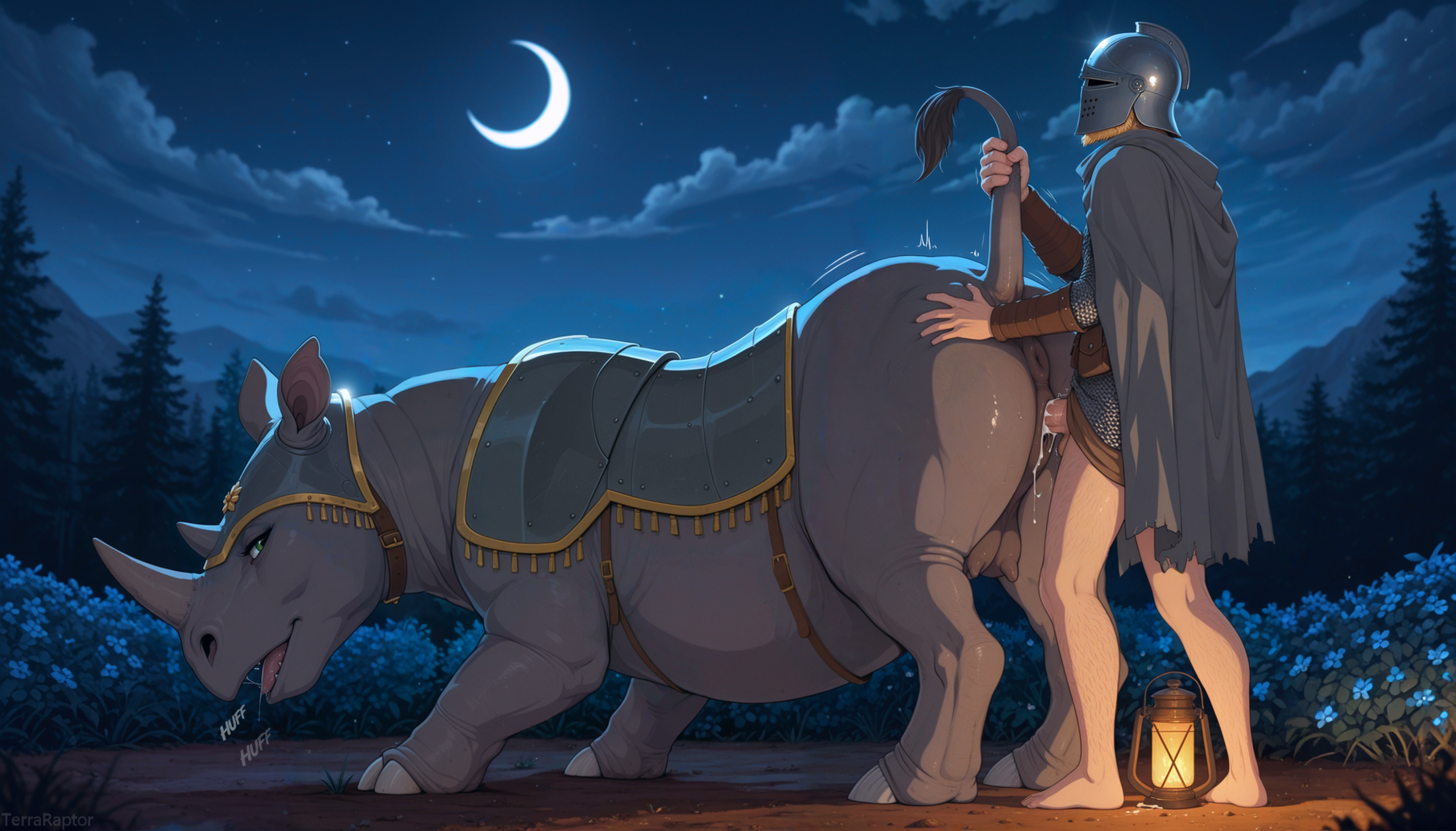 Night Patrol: A freelance mercenary running a patrol contract stops for a moment to tend to his rhino companion. The militant lifestyle these imposing species tend to fall into often results in perpetually heightened hormonal urges.