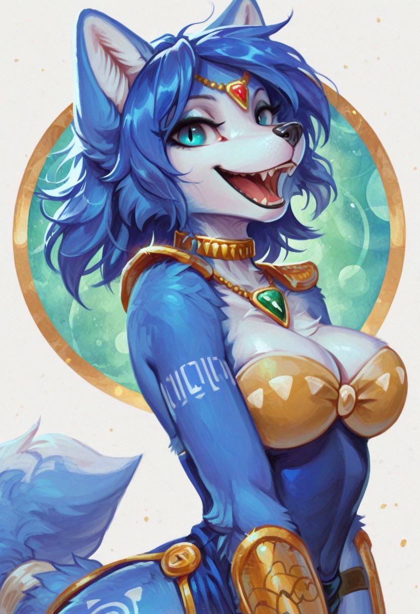 Prompt: looking at viewer, cartoon, very aesthetic, 4K, high quality, krystal girl, furry, sexy pose, solo, blue eyes, slit pupils, happy, medium breasts, (thin body:0.7), (blue dress:1.05), circle background, teeth, open mouth, rdf01