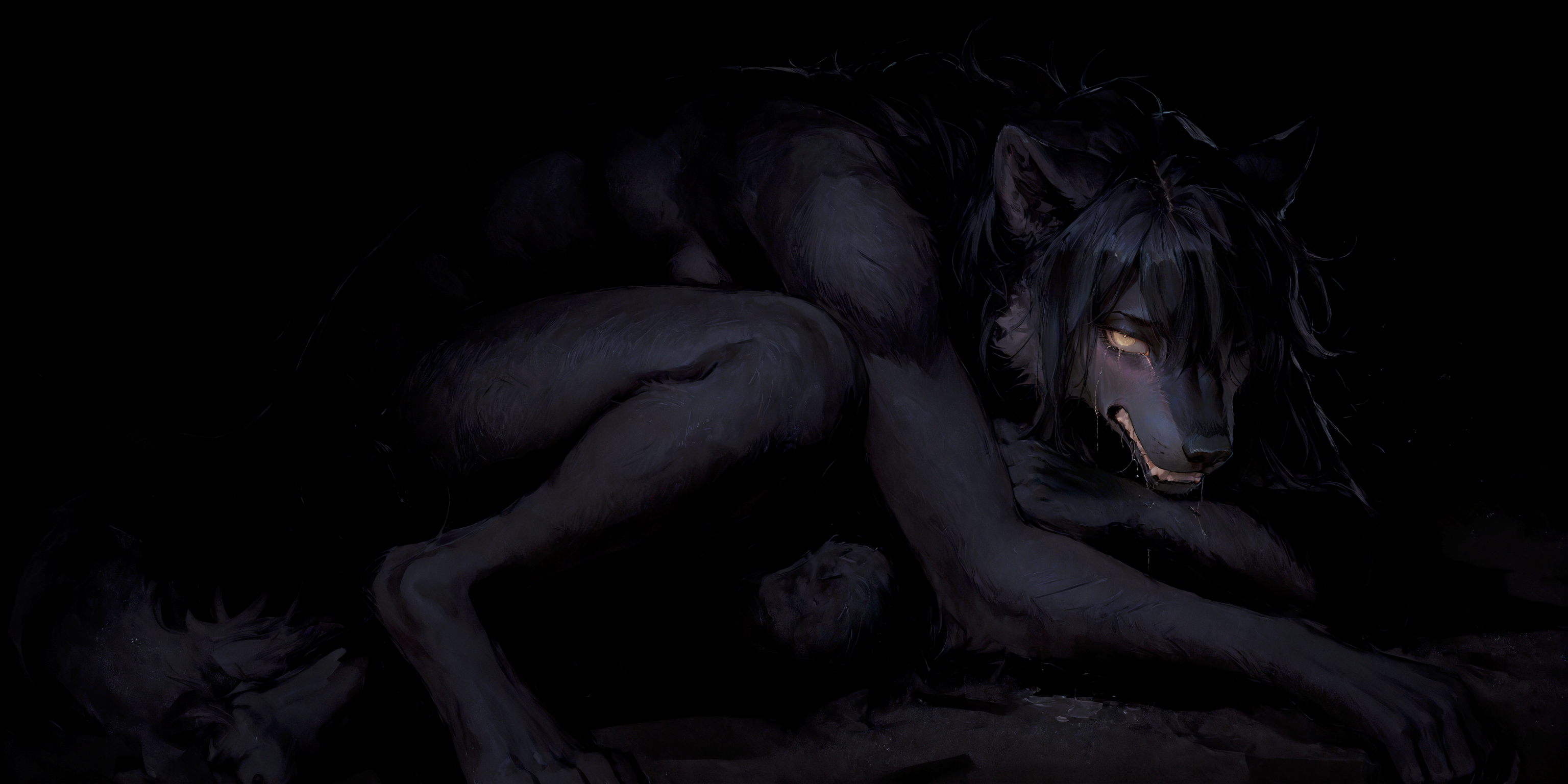 Juniper moments after transformation. Werewolves swell with intense emotion during their lunar shift, like a severe hormonal overload that sends the mind plummeting into lunacy. Feelings felt mere moments before are exponential, sometimes euphoria, sometimes utter dread, sometimes the gut-wrenching heartache of depression. Whatever still digesting that may be toxic to wolves from before her transformation will regurgitate. Transformation is a humiliating thing to Juniper, and often, she hides for days while she grows used to the body she will inhibit until the new moon.
