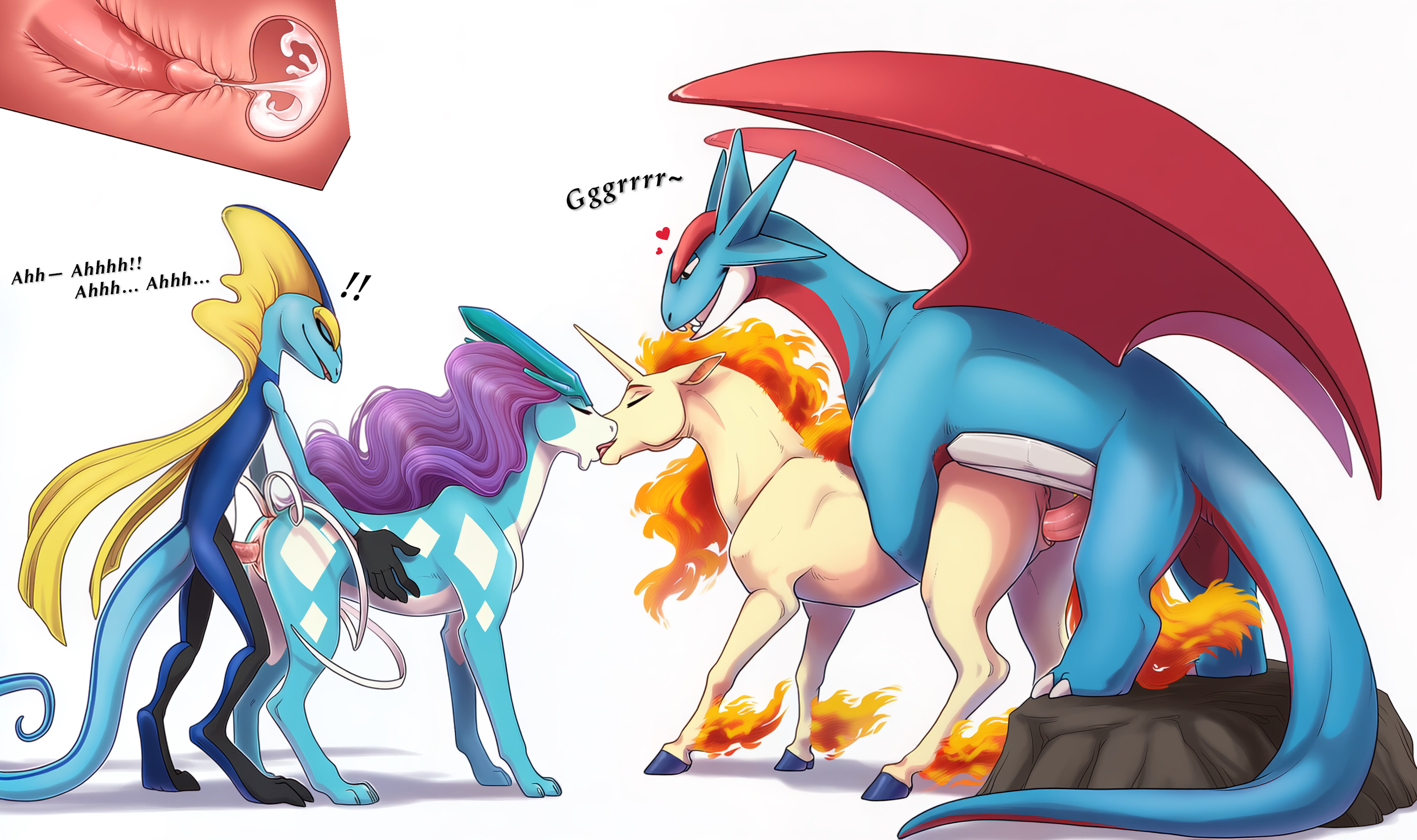 Salamence can’t help but to release a low growl of pleasure as he steadily thrusts his large penis into and back out of his mate’s vagina. Watching the two females below him kiss sloppily only spurs him on more, leading to his erection powerfully throbbing against Rapidash’s warm inner walls.