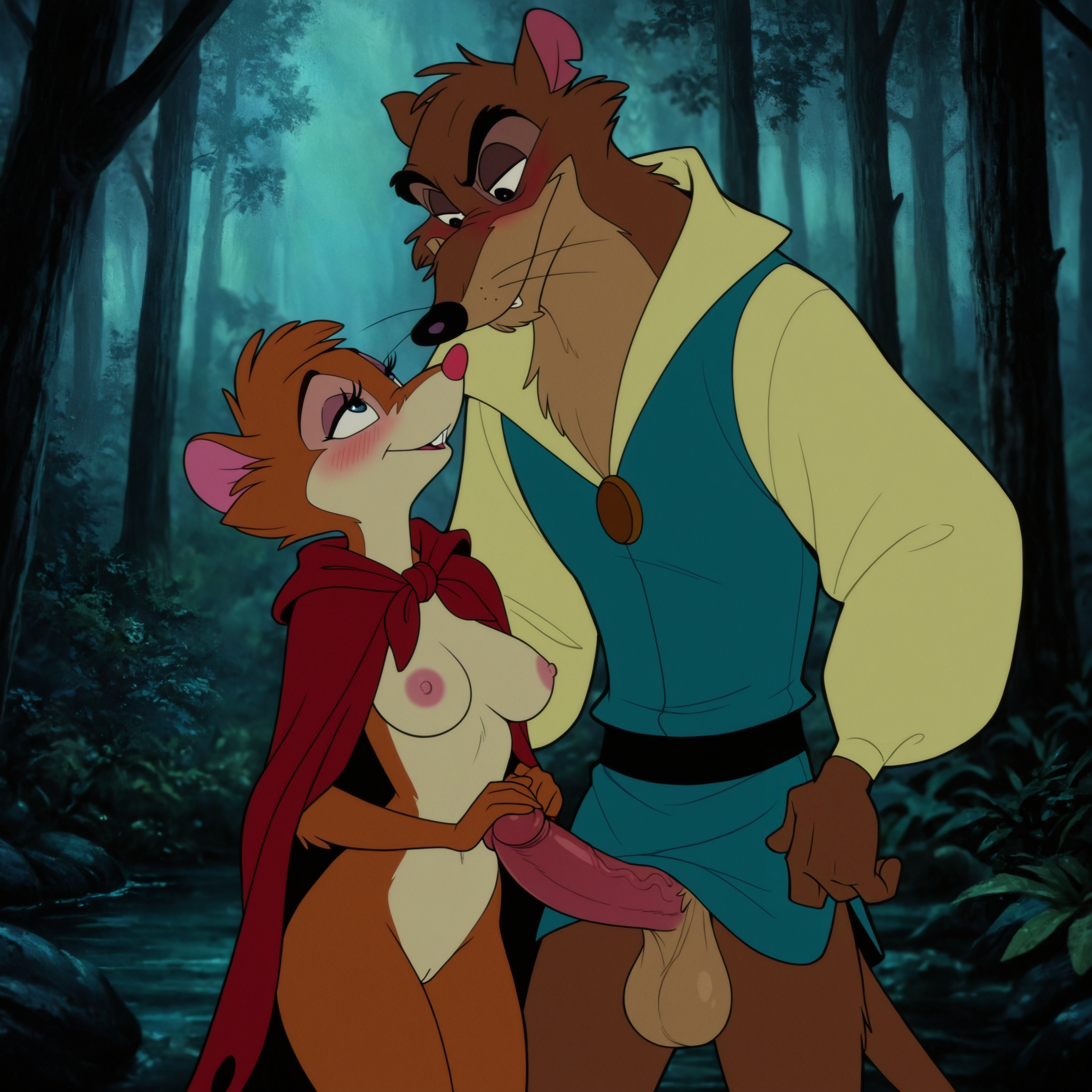 Mrs. Brisby’s eyes widened. Justin stood proud and unashamed, his cock already heavy and erect, thick and long, the flushed length curving slightly upward. Below, his balls hung full and heavy, covered in soft fur, swaying gently with his movement. He was magnificent—powerful, virile, utterly male.