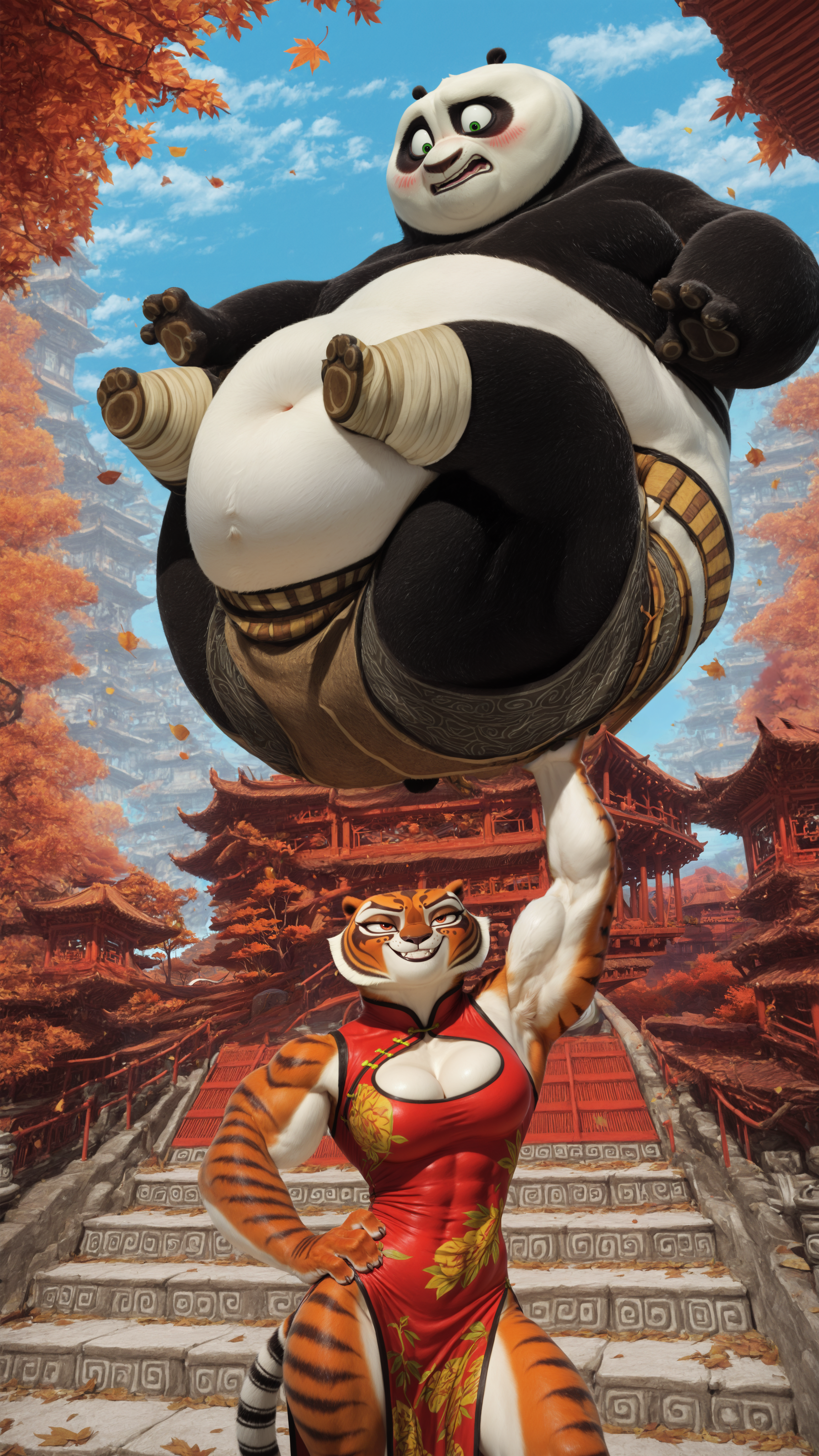 With a deep inhale, drawing in the mingled scents of dawn and desire, Tigress lifted. Po's feet left the ground, his body ascending as if weightless in her grasp. The world spun for him—the cool breeze against his fur, the taste of surprise on his lips, the sound of her steady grunts like a lover's sigh. "Tigress... you're incredible," he breathed, his voice laced with awe and affection, hands instinctively reaching to steady himself on her shoulders, feeling the play of muscles beneath.