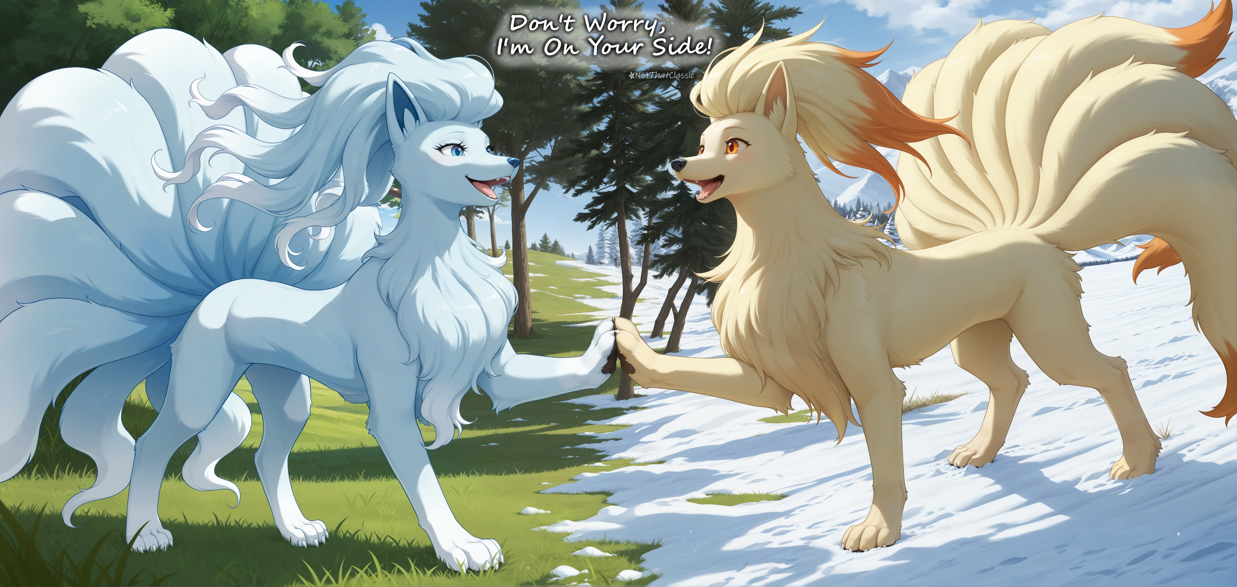 > Paws Together with Full Arms (from both of them in the middle, from each start of each arm): Ninetales, Alolan Ninetales, furry paws together, paws clapped together, high five of paws, paws, grassland on left, snow on right, tree trunks