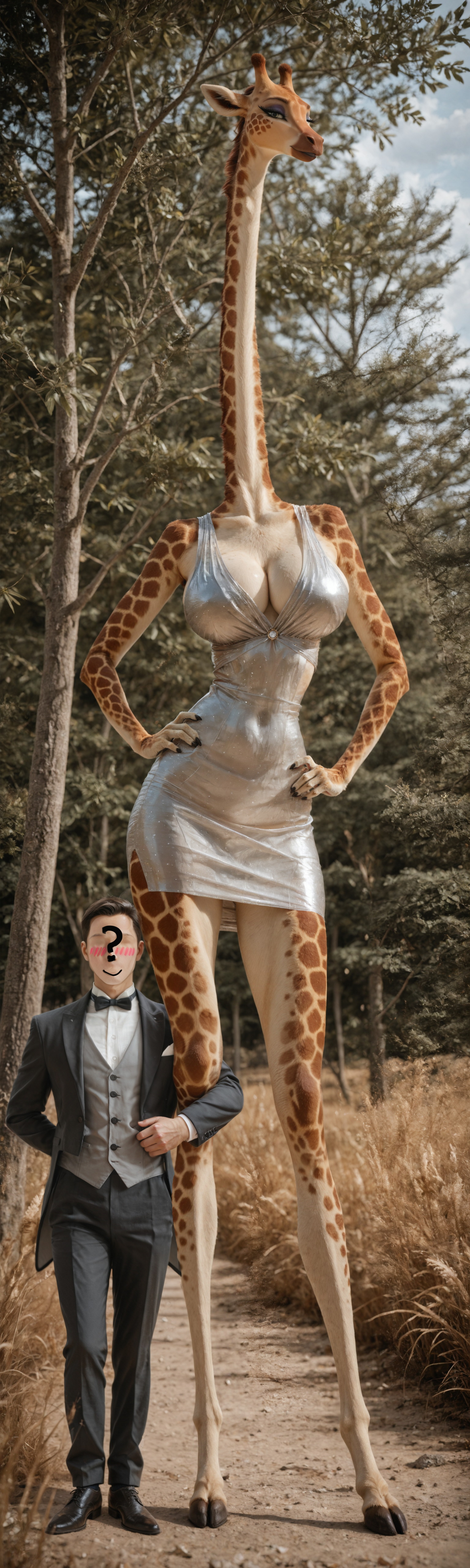 She towered over him like a living monument to grace and power, her giraffe form anthropomorphized into something breathtakingly feminine. Her long, elegant neck stretched toward the sky, spotted fur gleaming in the fading light, each patch a mosaic of caramel and cream that begged to be traced. From his vantage point, barely reaching above her knee, she seemed an endless expanse of allure: her legs, strong and endless, clad in the shimmering silver dress that hugged her curves like liquid moonlight. The fabric caught the sun's rays, sparkling with every subtle shift of her weight, the low-cut bodice revealing the swell of her bosom, adorned with a single glittering gem at her waist that winked like a secret invitation. Her arms, crossed confidently with hands on hips, ended in manicured black nails that tapped rhythmically against the dress, a sound like distant rain on tin. Zara's face, high above, was a vision of exotic beauty—blue eyeshadow framing eyes that sparkled with mischief, her lips curved in a knowing smile as she looked down at him, her ears twitching slightly at the sounds of birds calling in the treetops.