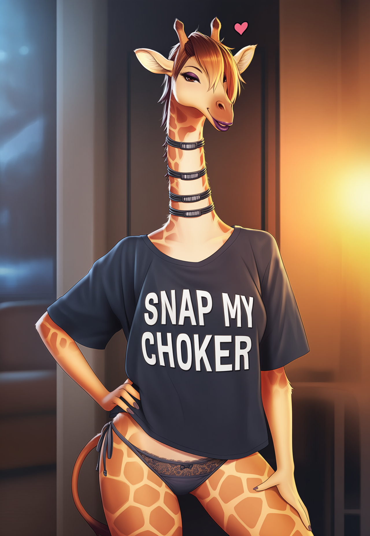 The dim glow of the city skyline filtered through the floor-to-ceiling windows of the penthouse apartment, casting elongated shadows across the plush carpet and sleek modern furniture. The air was thick with the scent of vanilla candles flickering on the nightstand, mingling with the faint, musky aroma of anticipation that hung between them like a promise. Zara, the anthropomorphic giraffe girl, stood there in the doorway of the bedroom, her lithe, spotted form silhouetted against the warm backlight from the hallway lamp. Her neck—oh, that impossibly long, elegant neck—stretched upward like a tower of temptation, adorned with four thick black chokers stacked one atop the other, each one a gleaming band of leather and metal buckles that hugged her tawny fur just tight enough to tease the idea of restraint. They started at the base where her shoulders met her throat and climbed higher, the topmost one sitting just below her chin, framing her smirking muzzle.
