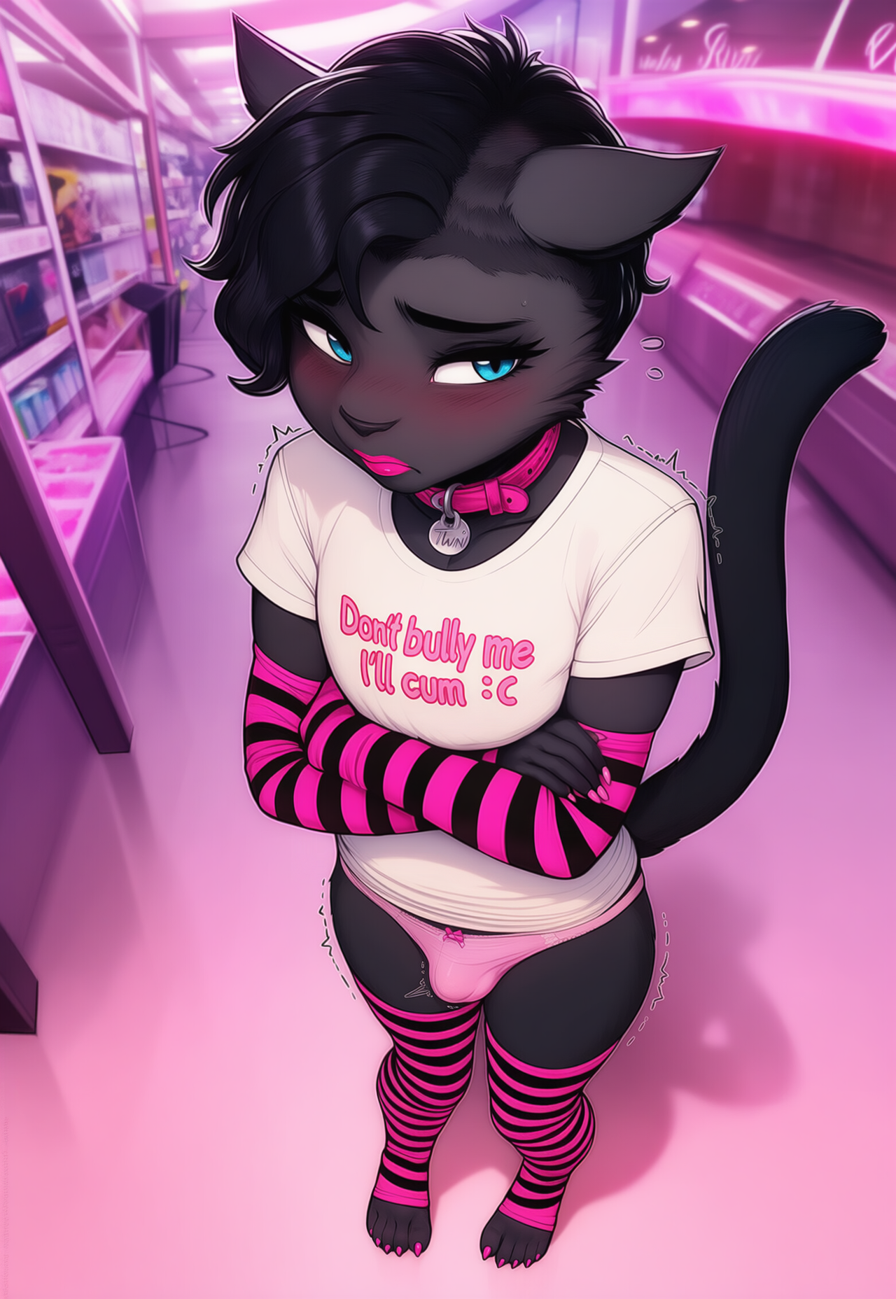 In the neon-drenched aisles of the 24-hour convenience store, where the hum of fluorescent lights buzzed like a swarm of lazy bees and the faint scent of stale coffee mingled with the chemical tang of floor cleaner, stood Whiskers—or at least that's what the bullies called him. He was a sleek black anthro cat boy, all slender limbs and twitchy tail, with fur as dark as midnight velvet and eyes like shimmering sapphires that always seemed to glint with a mix of defiance and dread. His outfit screamed "look at me but don't touch"—a tight white t-shirt emblazoned with pink letters reading "Don't Bully Me I'll Cum :c," paired with those ridiculous pink-and-black striped arm warmers and thigh-high stockings that hugged his lithe legs like candy wrappers. A pink collar jingled softly around his neck, the little bell tinkling with every nervous shift of his weight, and his pink panties peeked out just enough to make him blush furiously under his fur. He was the epitome of a twink cat boy: petite, effeminate, with a tiny cock and even tinier balls that betrayed him at the worst moments.