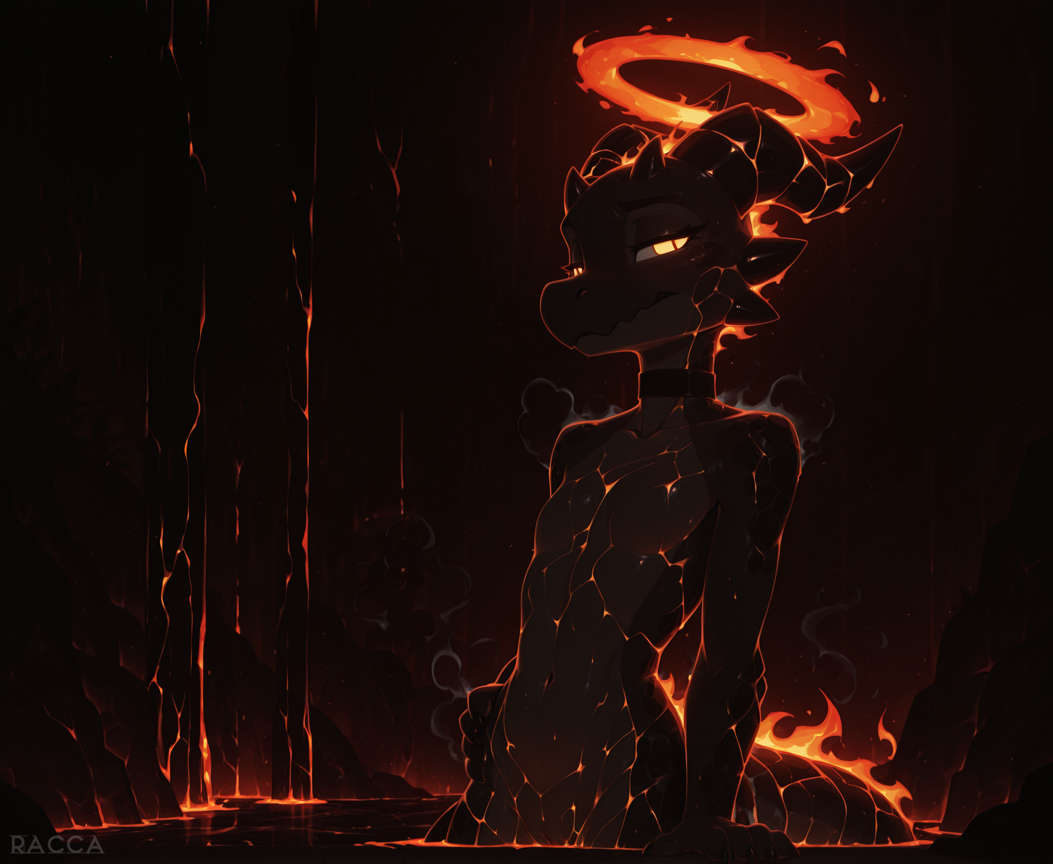 My fire-goddess kobold Myrrel taking a bath in a volcano.
